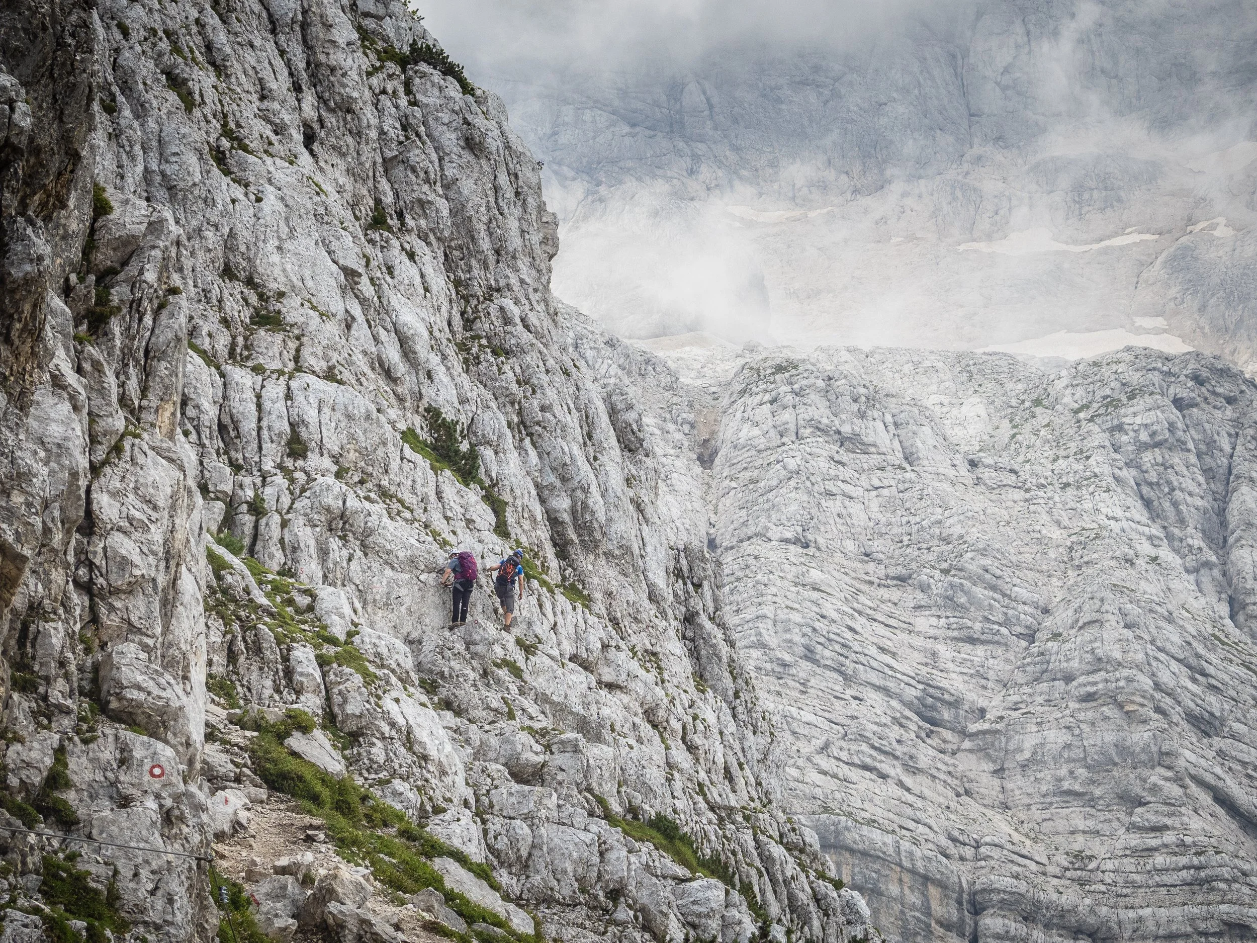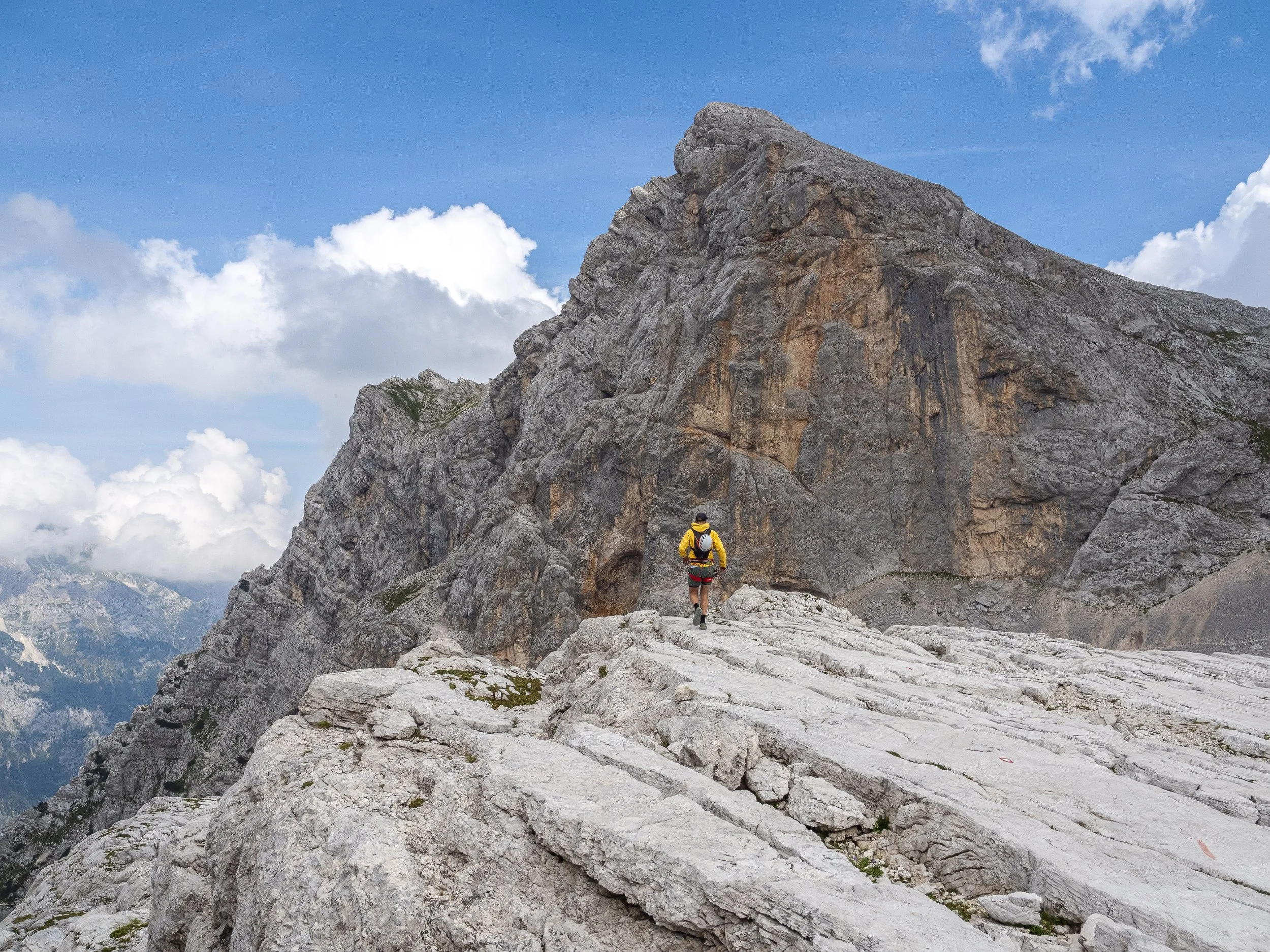 The early section of the route is largely alpine hiking. Nothing technically difficult here but it was tough going due to the steepness of the route. Poles sure helped. The second section of the Tominsek Route is where the via ferrata really comes into play (and this was, by far, the most enjoyable part of the route). It isn’t technically difficult, but it is sustained. With plenty of air below your boots, it demands a wee bit of focus, a steady rhythm, and a healthy trust in small iron rods hammered into pale limestone at some point in the past. Helmets on, lanyards clipped, poles stashed, this was where the fast-and-light philosophy met actual vertical terrain, and here it really comes into its own. To be able to move freely, with clean footwork, and nothing bulking out your pack, it becomes so enjoyable drift across the via ferrate sections of the route. That simplicity is no bad thing, especially when gravity is doing its quiet best to remind you who’s really in charge.
