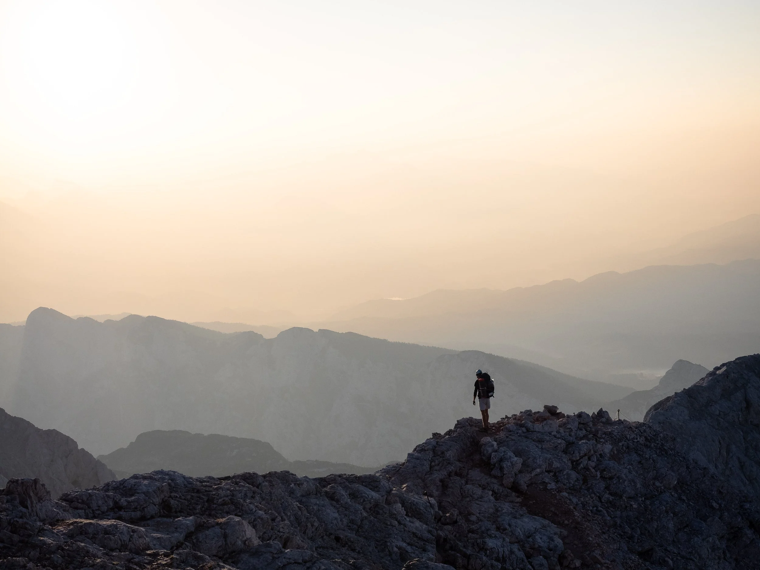 Given that the elevation difference between Triglavski dom and the summit is only 349 metres, the early start might seem a touch dramatic. But in the Alps, habits exist for good reasons, and starting early is no bad thing if you want to avoid spending too long moving in the hotter part of the day. We were also keen to catch sunrise while moving along the via ferrata and to reach the summit in that soft, early light, which can make even mildly anxious scrambling feel almost serene.