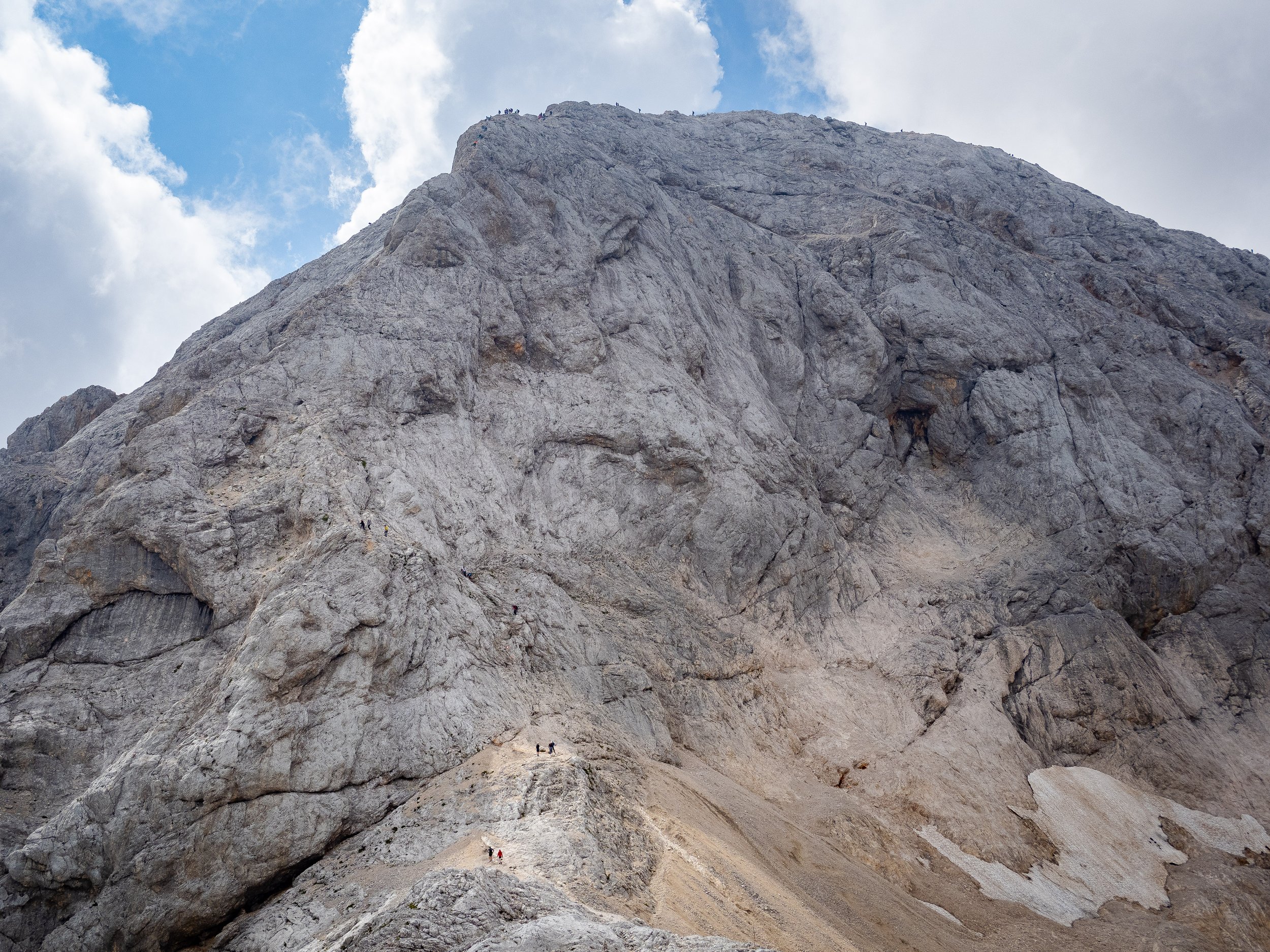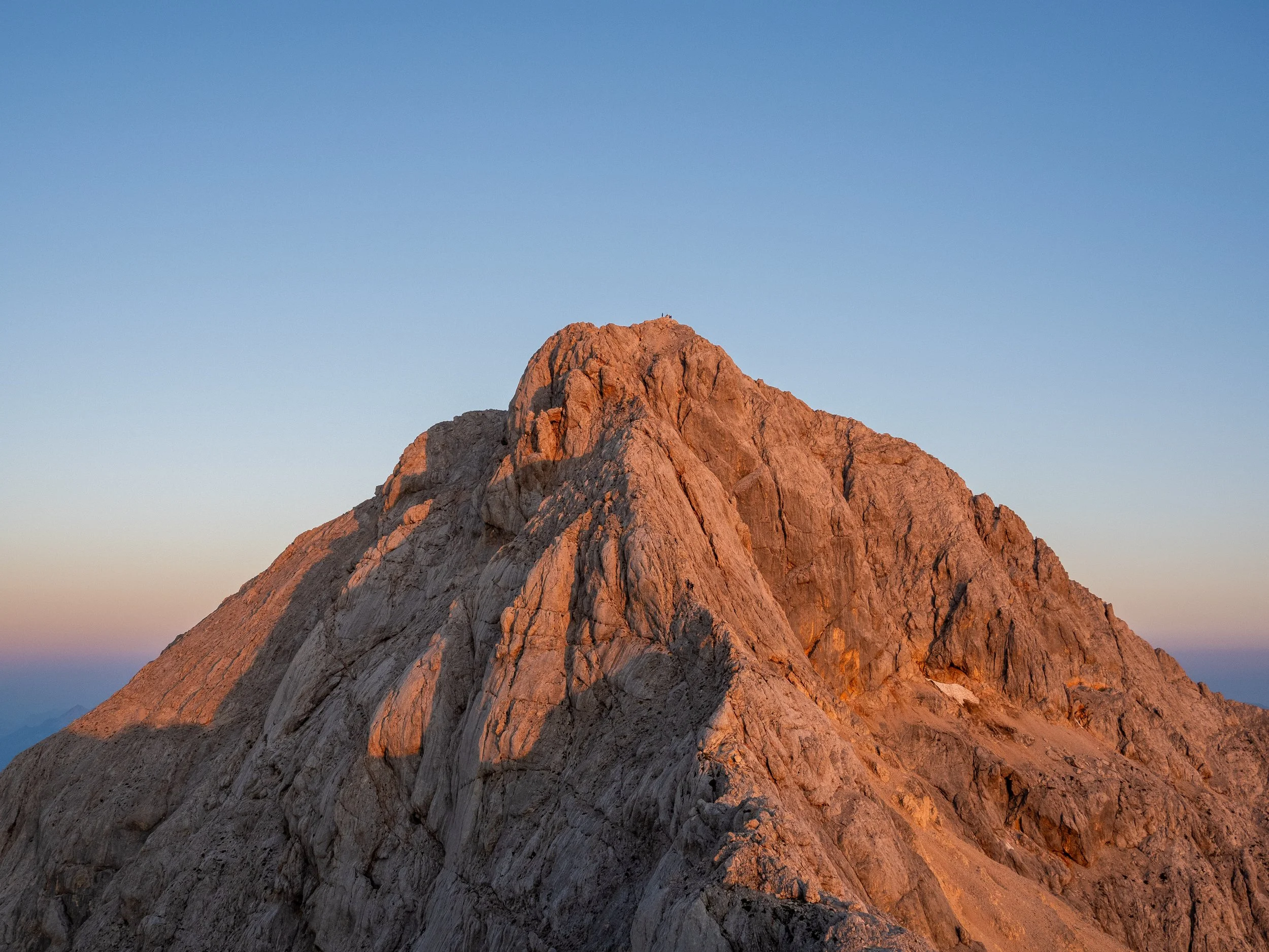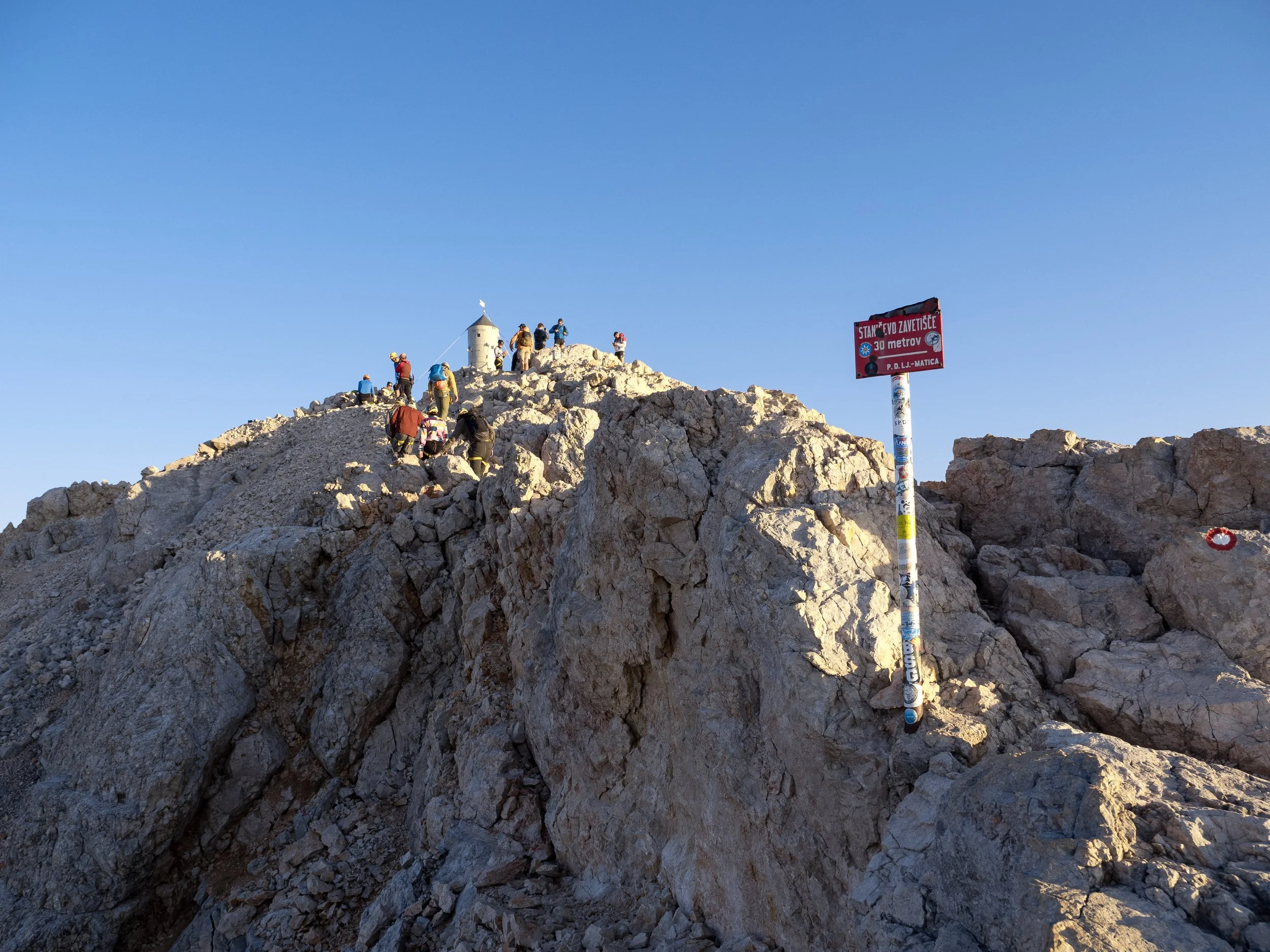 The summit itself is a fine place to linger for a bit. There is something deeply satisfying about standing there, looking out across the Julian Alps, and watching tiny figures in the distance slowly click off their head torches as they make their way towards the very spot where you are standing. At 2,864 metres, Triglav is modest by the standards of the great Alpine giants, Mont Blanc, the Matterhorn, and Gran Paradiso are all playing a rather different game, but it absolutely dwarfs anything we have in Cumbria, Wales, or Scotland. For seasoned alpinists, then, it is probably a pleasant morning out. For those more accustomed to the gentler Wainwrights of the Lake District, it feels like an absolute rock monster. And crowning it all is the Aljaž Tower, the little metal summit shelter that everyone appears compelled to touch, as if failing to do so would somehow invalidate the entire ascent.