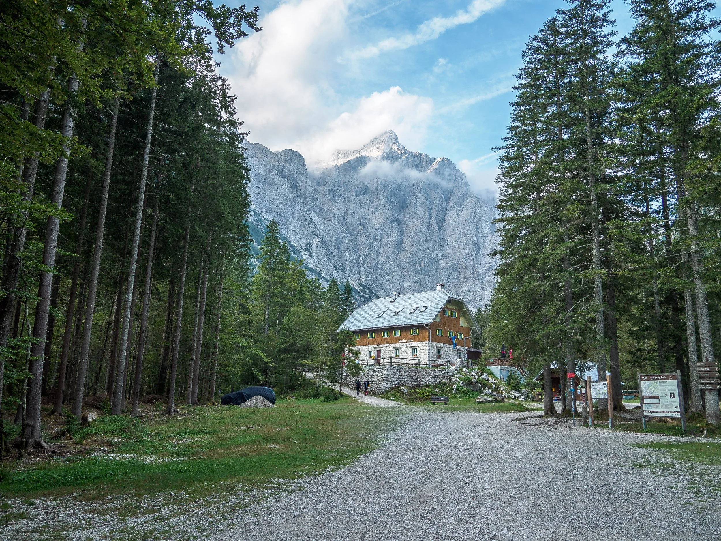 Short sections of cable provide reassurance and somewhere to steady yourself while pretending you stopped to admire the view rather than catch your breath. Gradually the harsh alpine terrain gives way to grass, dwarf pine, and finally forest, where shade and oxygen feel like small miracles. The descent drags just long enough to encourage reflection on pacing decisions, before Aljažev Dom appears, along with the deeply earned reward of sitting down and not moving again for a while.
