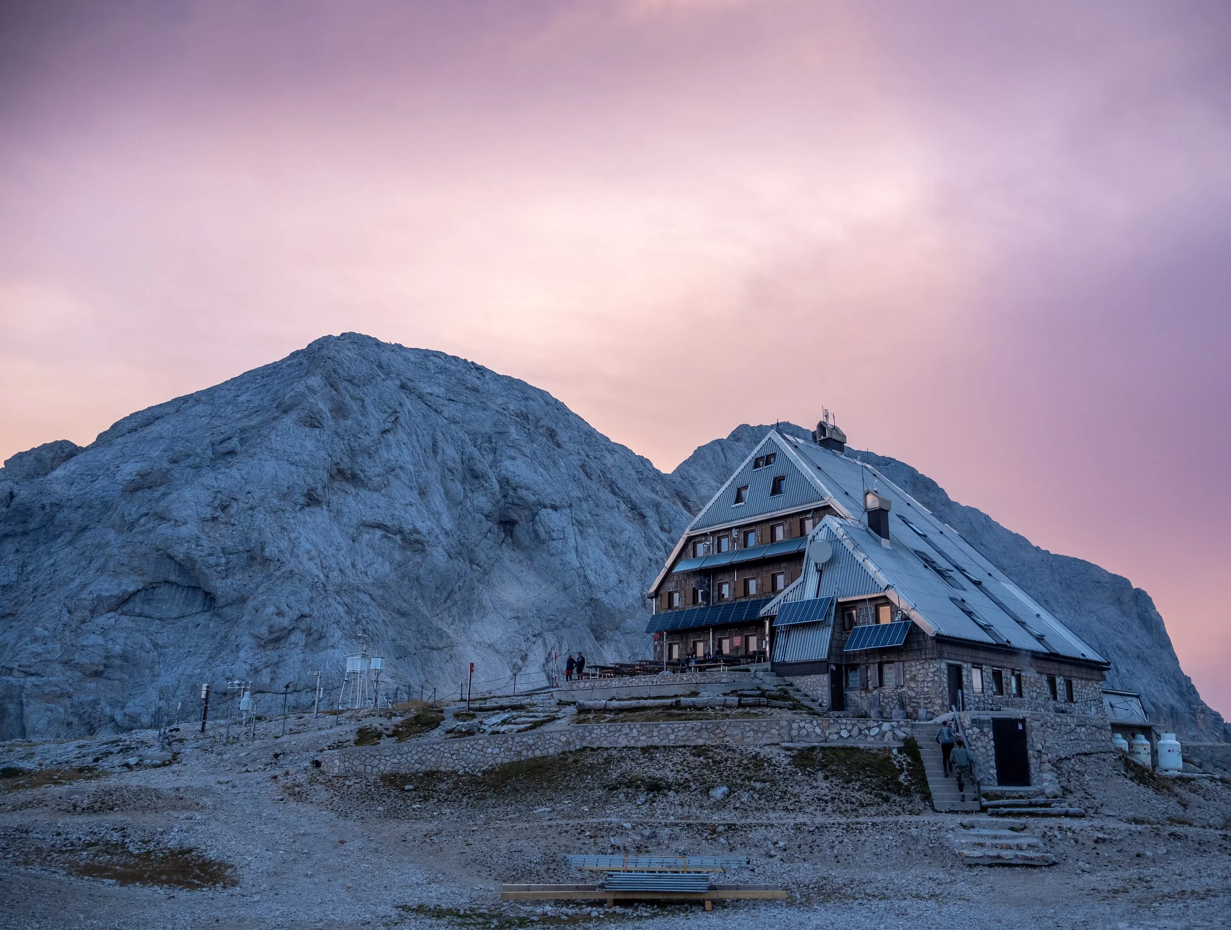 Outside of the hut a small display shows how big the glacier on the north face of Triglav used to be. It shows how in the nineteenth century it stood at 40 hectares (), today it’s less than a single, solitary one. For so many huts in the recent past, much like this one, melt water from the surrounding glaciers provided just about all it needed. Of course, water would still need to be stored and managed, but this was never so much of a logistical issue. Today pretty much all water needs to be flown in by helicopter, in plastic bottles. This is hardly cheap (and certainly not so ecological) and helps explain the prices of hydration at Triglavski dom.